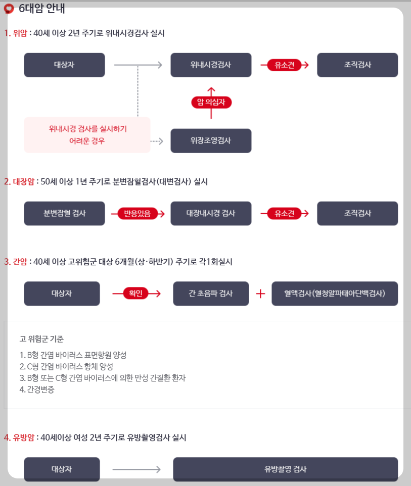 - 암 검진 : 위암, 간암, 대장암 등 주요 암에 대한 무료 검진 혜택을 받을 수 있습니다. 연령과 성별에 따라 제공되는 검진 항목이 다르니, 자세한 사항은 건강보험 관리공단 홈페이지에서 확인하세요.
