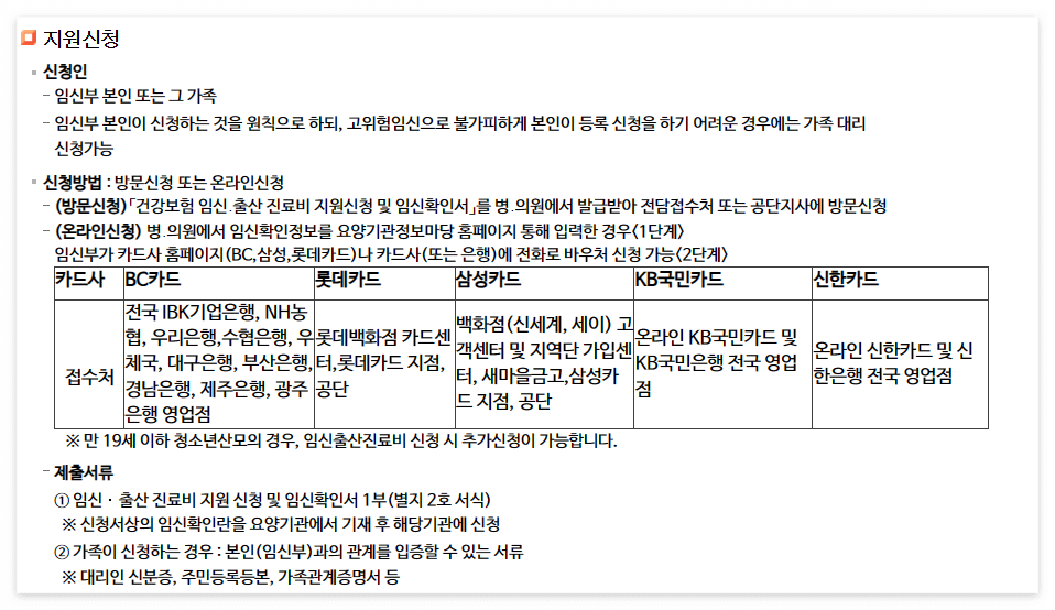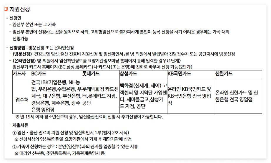 - 신청인 : 임신부 본인 또는 그 가족이 신청할 수 있으며, 보통 임신부 본인이 신청하는 것을 원칙으로 합니다.