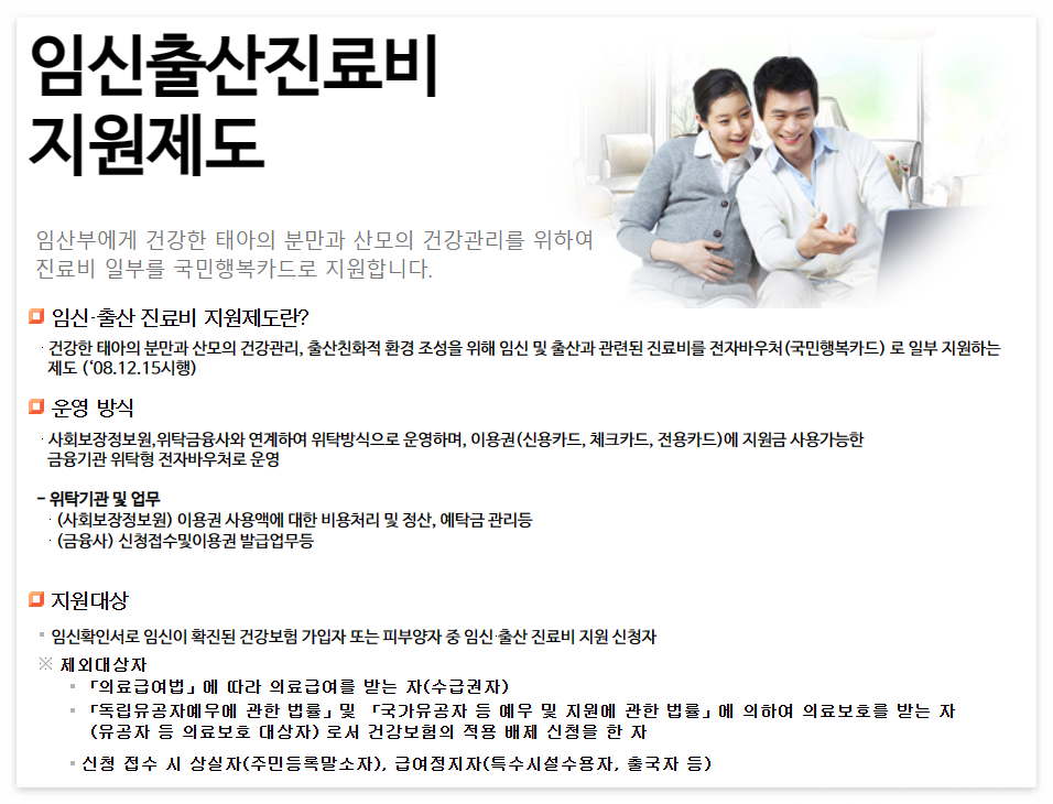 - 목적 : 건강보험은 임신과 출산에 관련된 의료비 부담을 경감하여 출산 친화적 환경 조성과 건강한 태아 분만을 위해 본인 일부 부담금을 지원하는 이용권을 제공합니다.