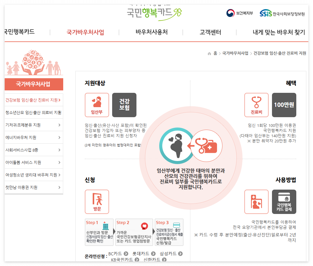- 국민행복카드 : 임신 및 출산과 관련된 진료비 일부를 지원받을 수 있는 카드로, 이는 사회보장정보원과 연계하여 이용권 형태로 운영됩니다.