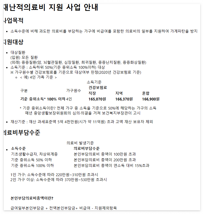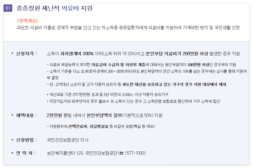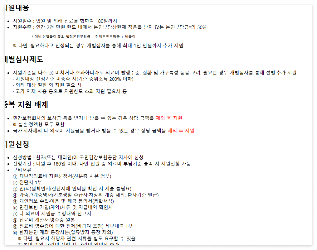 - 의료급여 수급자 및 차상위 계층은 본인부담액 100만원 이상 발생 시 지원 가능
