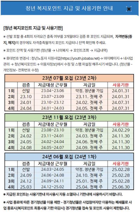 - 경기도 거주 및 사업장 근속이 지원금 지급 조건에 포함되므로 변동 시 1개월 이내 청년노동자지원사업 콜센터에 연락 필요