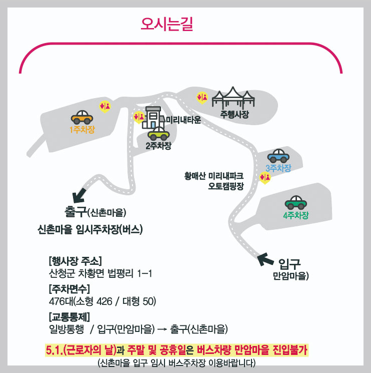 - 주차장은 축제장과 인접해 있으며 안전하게 관리됩니다.