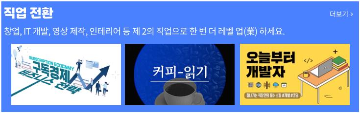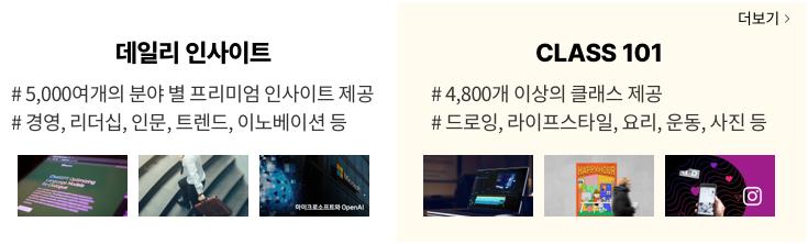 - 구독제 서비스: 인기 온라인 강의 플랫폼 (데일리 인사이트, 클래스101) 강의 1만여 개 제공(이용료 월 15,000원)