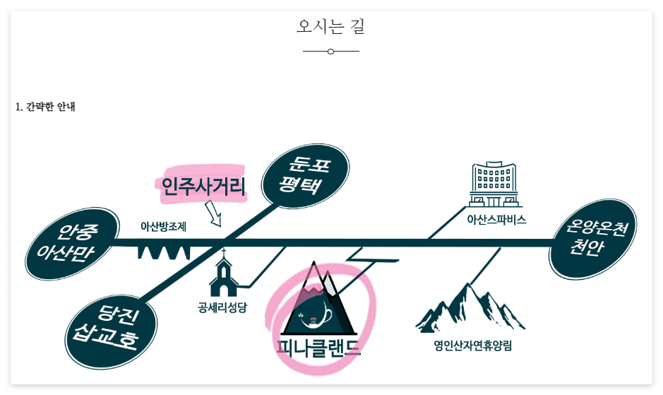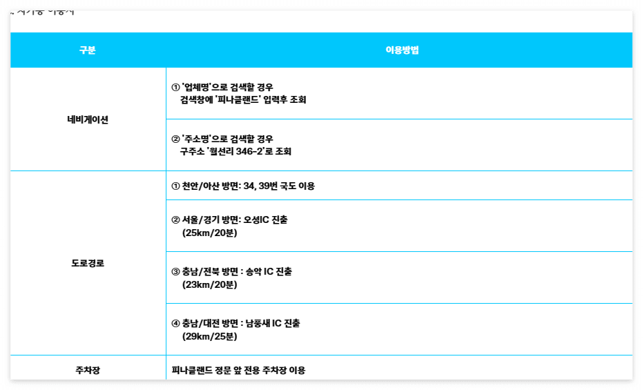 ■ 피나클랜드 정문 앞 전용주차장 이용 : 네비게이션: 피나클랜드, 또는 충남 아산시영인면 월선리 346-2