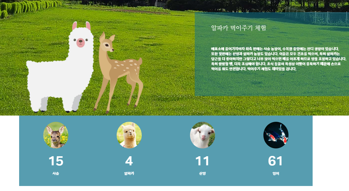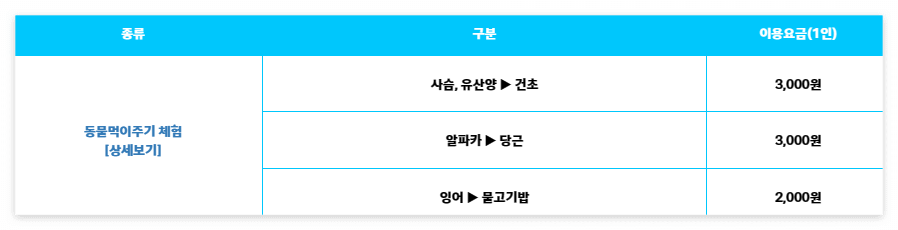 - 동물 먹이주기 체험비 : 사슴, 유산양 → 건초: 3,000원(1인), 알파카 → 당근 3,000원(1인), 잉어 → 물고기밥 2,000원(1인)