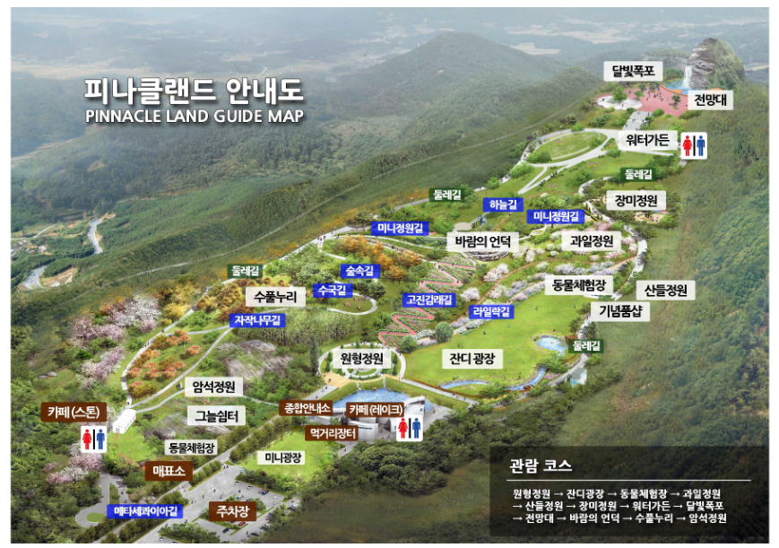 피나클랜드 관람코스 ▷ 원형정원 → 잔디광장 → 동물체험장 → 과일정원 → 산들정원 → 장미정원 → 워터가든 → 달빛폭포 → 전망대 → 바람의 언덕 → 수풀누리 → 암석정원