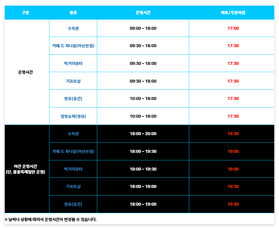 - 카페 드 피나클(아산본점) : 09:30~18:00 / 매표마감: 17:30