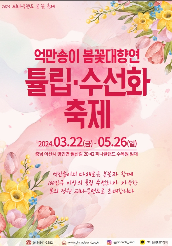 충남 아산 피나클랜드에서 세번째로 선보이는 봄꽃축제로 마을 주민들과 함께 직접 가꾼 억만송이의 다양한 봄꽃과 튤립,수선화가 피나클랜드를 가득 채웁니다. 주말에는 버블쇼, 사물놀이, 음악회 등 매주 다양한 이벤트를 진행한다. 피나클랜드 내부의 카페 드 피나클에서는 봄꽃에이드, 봄꽃쌍화차 등 특별메뉴와 함께 먹거리장터에서는 다양한 음식들까지 즐길 수 있으니 꼭 방문해 보세요~!