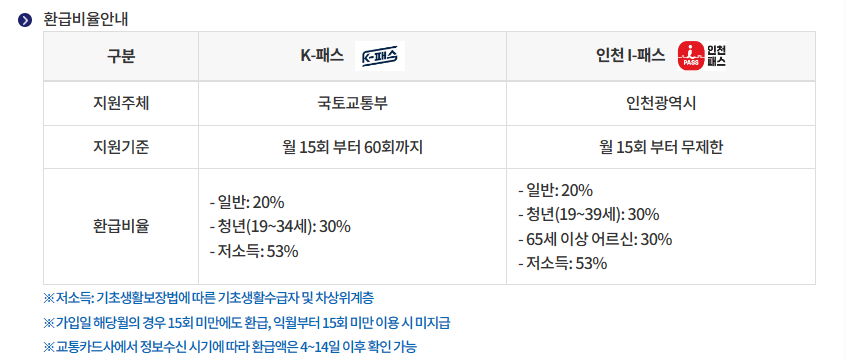 - 무제한 환급 : 인천 I패스는 월 15회 이상 대중교통 이용 시 무제한으로 교통비를 환급받을 수 있습니다.