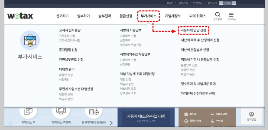 연납 신청 : 위택스 사이트 → 부가서비스 → 자동차세 연납신청