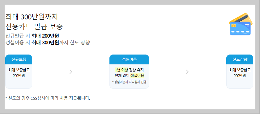 - 보증기간 중 카드 이용한도는 최초로 부여한도 이내에서 증감이 가능하며 따로 카드사 변경은 불가합니다.
