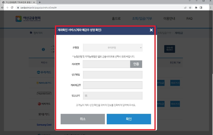 카드포인트통합조회 / 계좌입금 / 기부 언제나 함께하면 행복합니다. 든든한 신뢰의 최고 파트너가 되겠습니다.