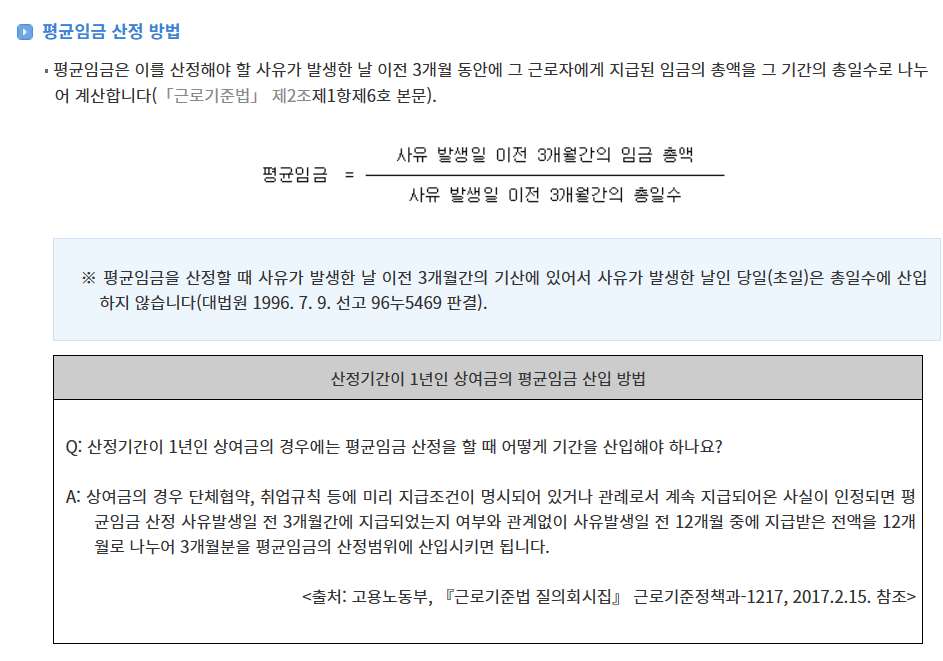 - 산정 시점 이전 3개월 동안 지급된 임금 총액을 총 일수로 나누어 일 평균 금액을 도출합니다.