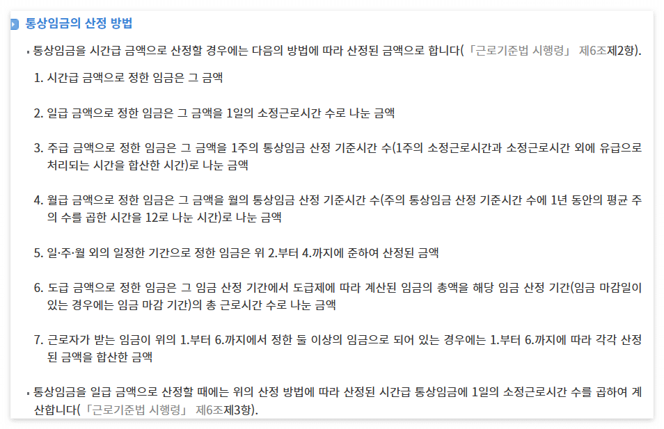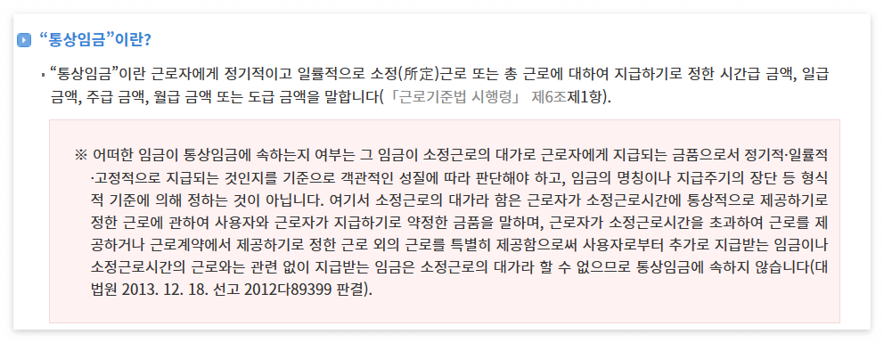 - 통상임금 : 연장, 야간, 휴일 근로 수당, 해고 예고 수당 등에 적용됩니다.