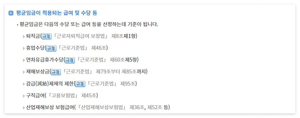 평균임금, 퇴직금, 휴업수당, 연차유급휴가수당, 재해보상금, 구직급여, 산업재해보상 보험급여, 평균임금 최저한도, 휴업보상금, 장해보상금