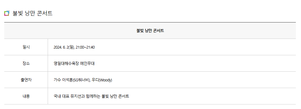 - 불빛 낭만 콘서트 : 6월 2일(일) 21:00 ~ 21:40