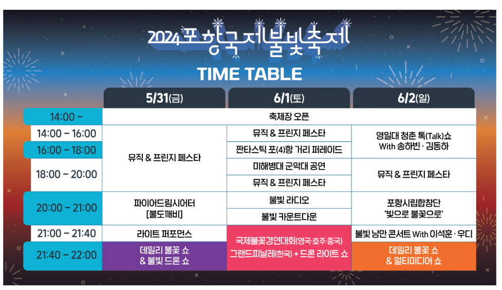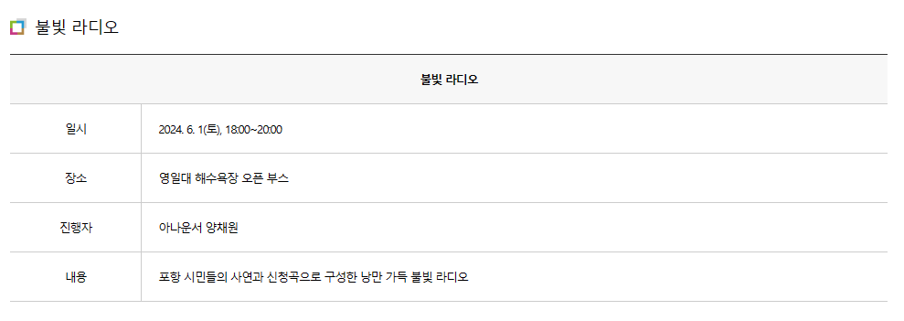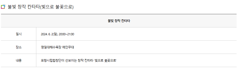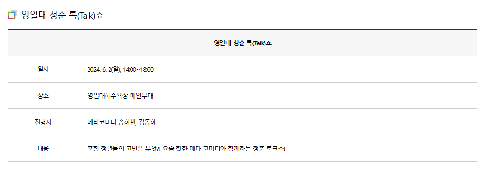 - 영일대 청춘 톡(Tark) 쇼 : 6월 2일(일) 14:00 ~ 18:00