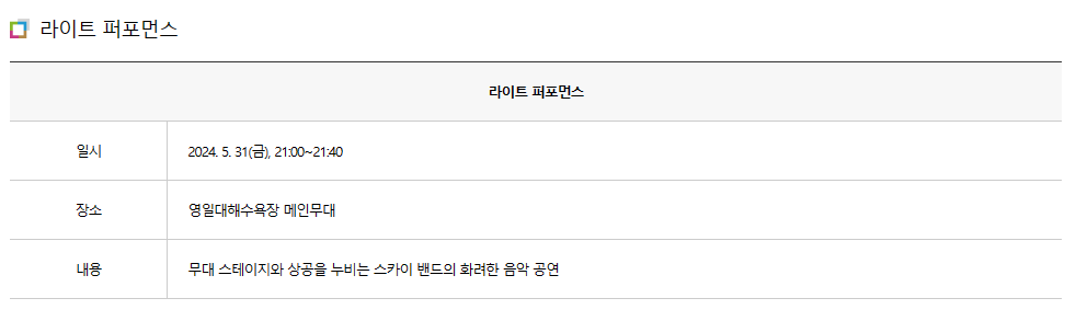 - 라이트 퍼포먼스 : 5월 31일(금) 21:00 ~ 21:40