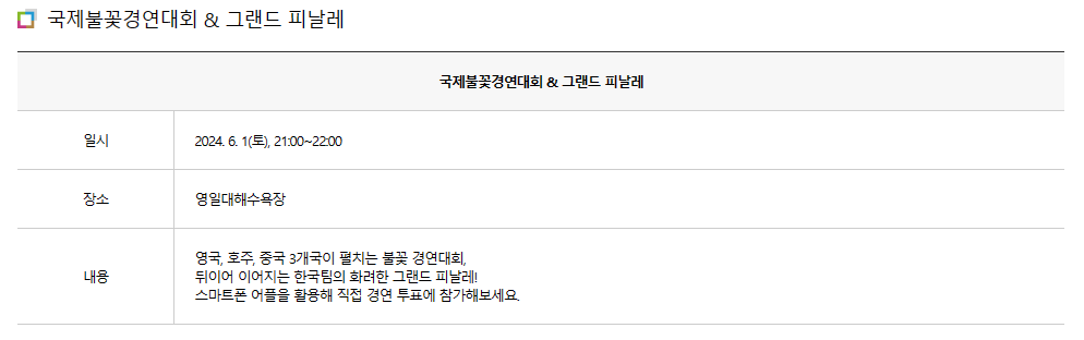 - 국제불꽃경연대회 & 그랜드 피날레 : 6월 1일(토)/ 21:00 ~ 22:00