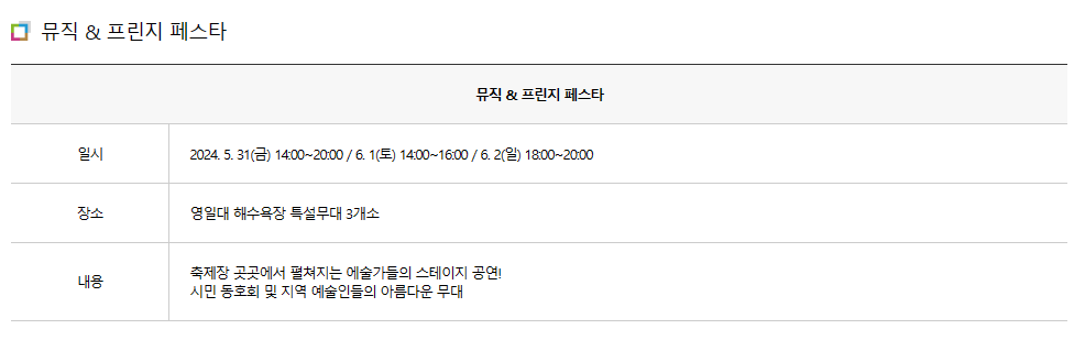 - 뮤직& 프린지 페스타 : 5월 31일 ~ 6월 2일