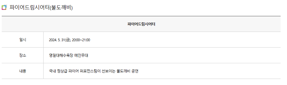 - 파이어드림시어터(불도깨비) : 5월 31일(금) 20:00 ~ 21:00