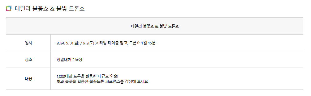 - 데일리 불꽃쇼 & 불빛 드론쇼 : 5월 31일(금) / 6월 2일(토)