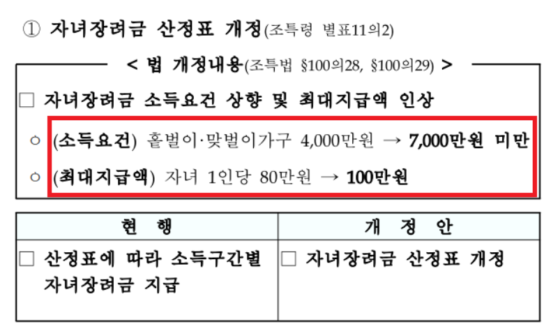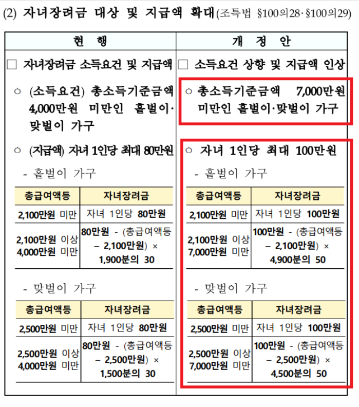 . 홑벌이 가구의 경우 2,100만원 미만 : 자녀 1인당 100만원