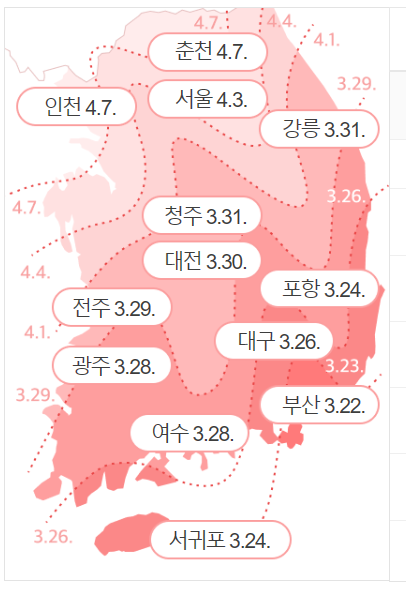 - 예년과는 다르게, 남부지방은 3월 21일부터 24일까지 벚꽃이 본격적으로 개화될 것으로 예상됩니다. 이 기간 동안 남부지방은 화사한 벚꽃으로 물들일 것입니다. 중부지방은 3월 21일부터 4월 3일까지 다양한 지역에서 벚꽃이 피어날 것으로 예측되어, 이 기간 동안 다채로운 풍경을 만날 수 있을 것입니다.