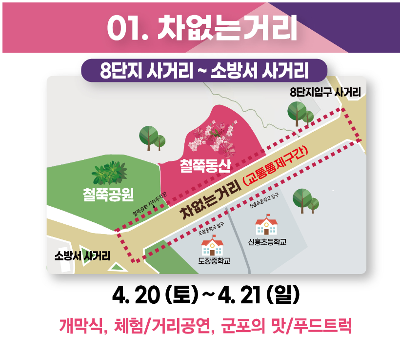 - 개막식 : 2024년 4월 20일(토)에는 차 없는 거리에서 다채로운 프로그램이 펼쳐집니다.