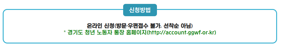 - 온라인 신청만 가능합니다. 청년 노동자 통장 홈페이지인 account.ggwf.or.kr에서 신청하세요.