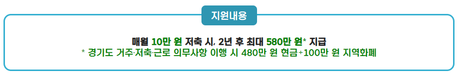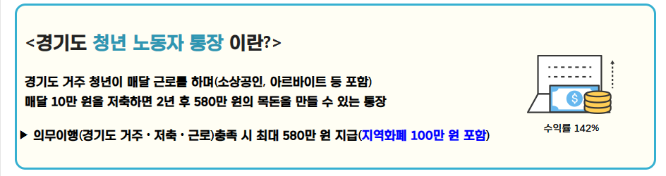 - 경기도 청년 노동자 통장은 경기도에 거주하는 중위소득 120% 이하 가구의 청년들을 위한 지원 프로그램입니다. 매월 10만원을 저축하여 2년 후에는 580만원을 받을 수 있는데, 이는 청년들의 노동 의지와 취업 의지를 높이고 금융 역량을 키워 미래에 대한 대응력을 강화하기 위한 것입니다.