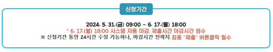 - 신청 기간은 5월 31일 오전 9시부터 6월 17일 오후 6시까지입니다. 마감 시간을 엄수하여 제출하세요.