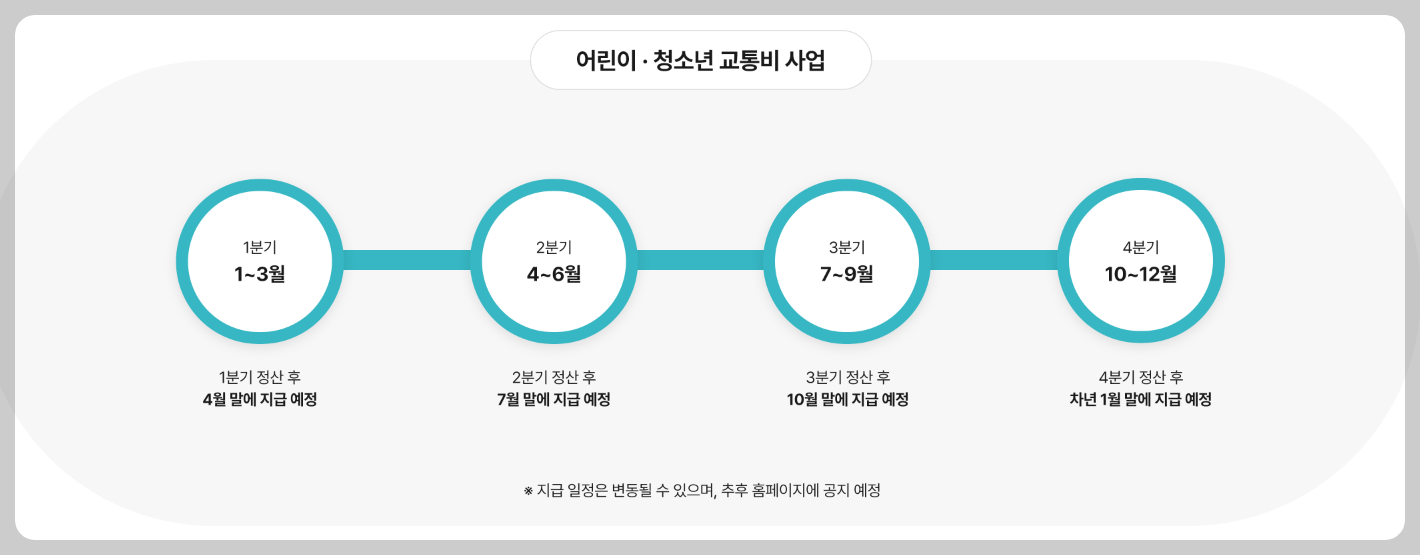 - 자세한 내용은 경기도 청소년 교통비 지원 [포털 사이트] 에서 확인하실 수 있습니다.