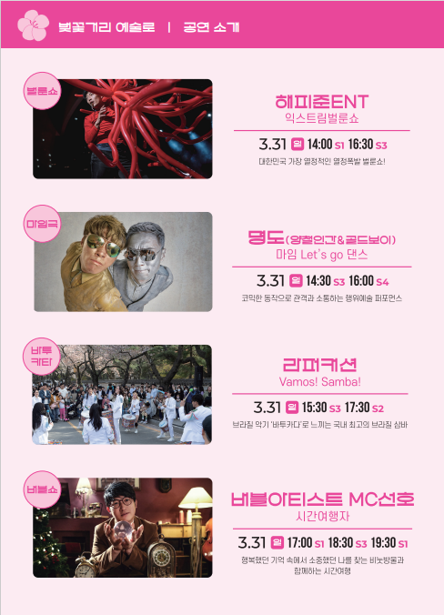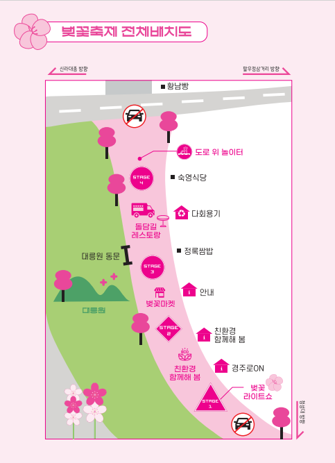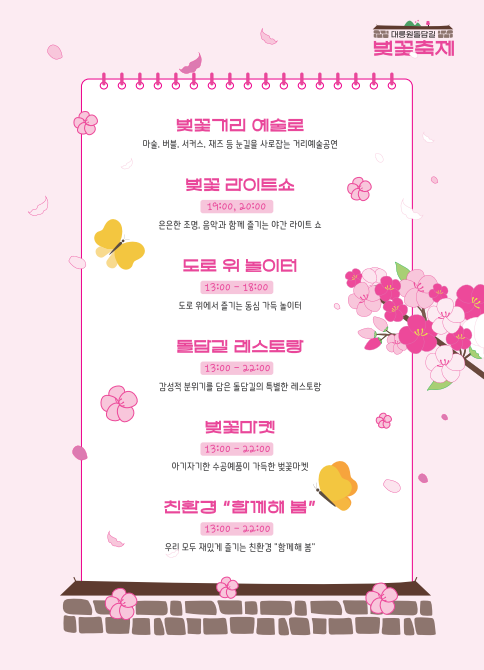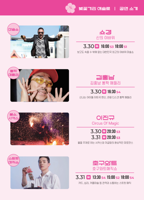- 공연 프로그램 : 벚꽃거리예술로, 벚꽃 라이트쇼 등 다양한 공연이 펼쳐집니다.