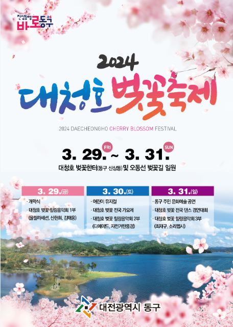 - 3월 31일 : 동구 주민 문화예술 공연 / 대청호 벚꽃 전국 댄스 경연대회 / 대청호 벚꽃 힐링음악회 3부 (최재구, 소리맵시)