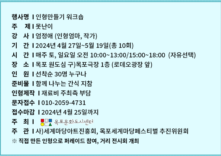 - 인형 만들기(4월 27일 ~ 5월 19일(총 10회)/로데오 광장)
