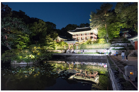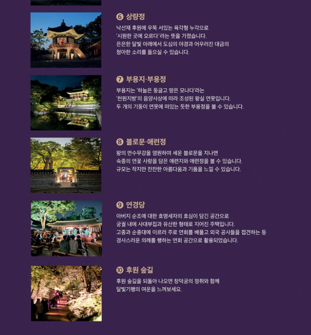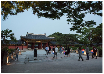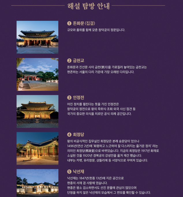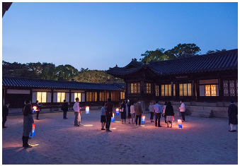 - 야간기행 : 해설사의 이야기를 통해 창덕궁의 역사, 문화, 조경을 자연스럽게 체험할 수 있는 야간 기행