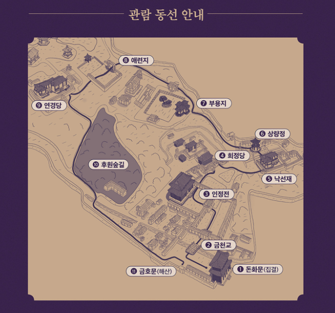 - 창덕궁 정문인 돈화문 관람 동선: 돈화문 → 진선문 → 인정전 → 희정당 → 낙선재 → 상량정 → 부용지 → 불로문 → 애련정 → 연경당 → 후원 숲길